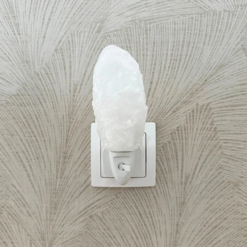 Het nachtlampje straalt een zacht, puur licht uit door de bergkristal, Een edelsteen die bekend staat om zijn reinigende en versterkende werking.