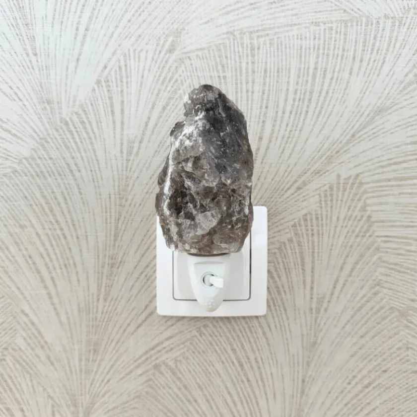 Het nachtlampje straalt een zacht, warm licht uit door de rookkwarts, een edelsteen die bekend staat om zijn stabiliserende en beschermende werking.