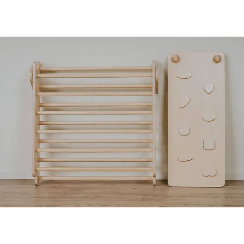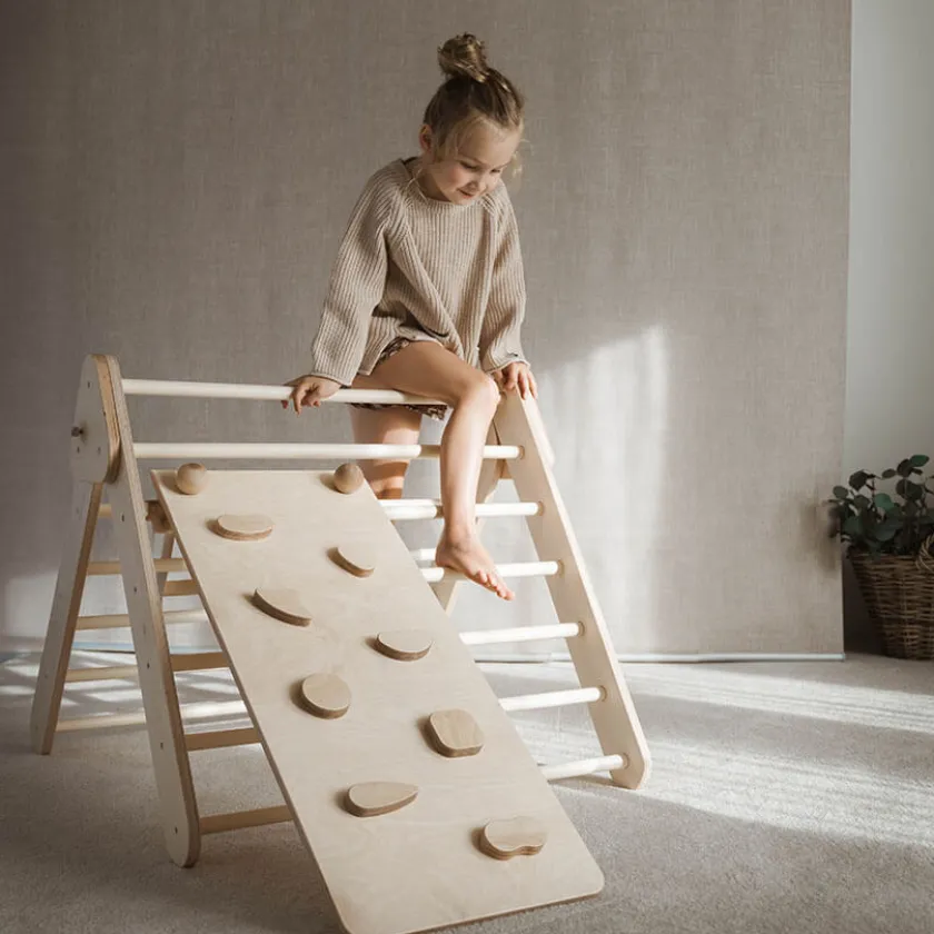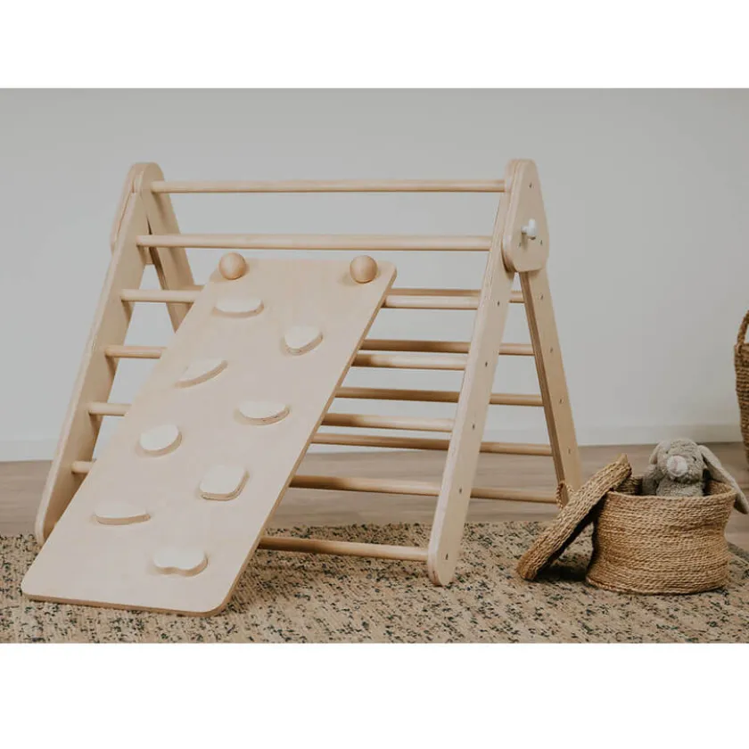 Dit prachtige houten klimrek voor binnen is vernoemd naar Dr. Emmi Pikler (1902-1984). En heeft de naam “Pikler Driehoek”. Dit klimrek biedt een klimstructuur die kinderen in hun eigen tempo leren navigeren. Met de Pikler driehoek kunnen kinderen hun lichaam verkennen, hun grenzen begrijpen en inspelen op hun klimbehoeften.