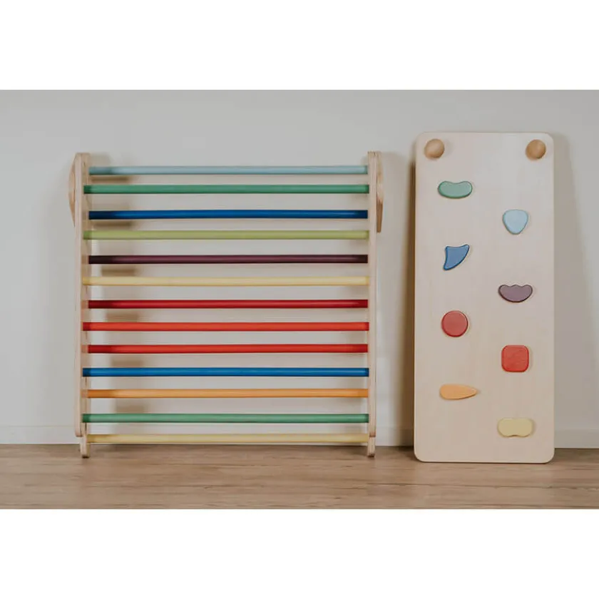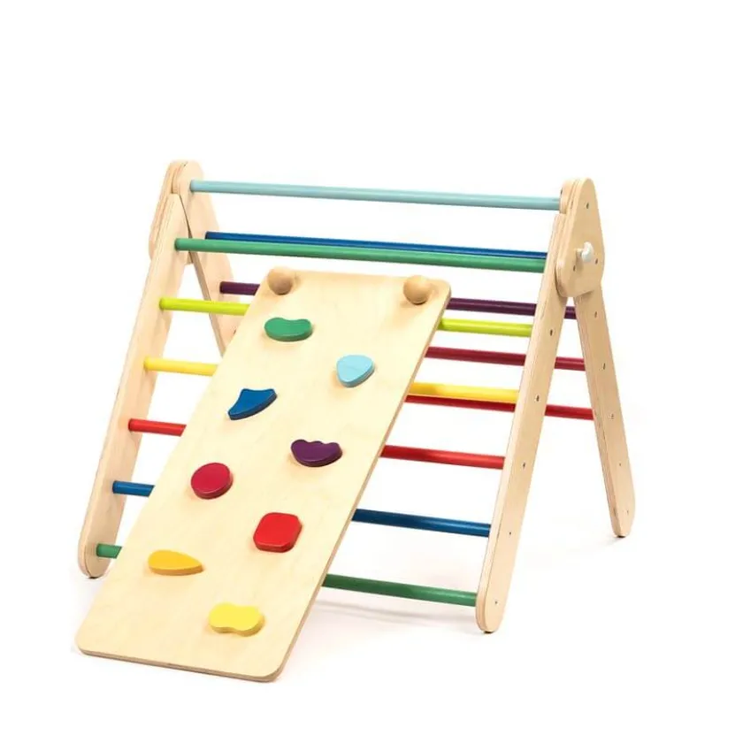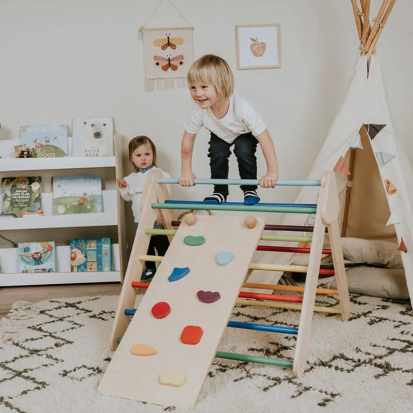 Dit prachtige houten klimrek regenboog voor binnen is vernoemd naar Dr. Emmi Pikler (1902-1984). En heeft de naam “Pikler Driehoek”. Dit klimrek biedt een klimstructuur die kinderen in hun eigen tempo leren navigeren. Met de Pikler driehoek kunnen kinderen hun lichaam verkennen, hun grenzen begrijpen en inspelen op hun klimbehoeften.