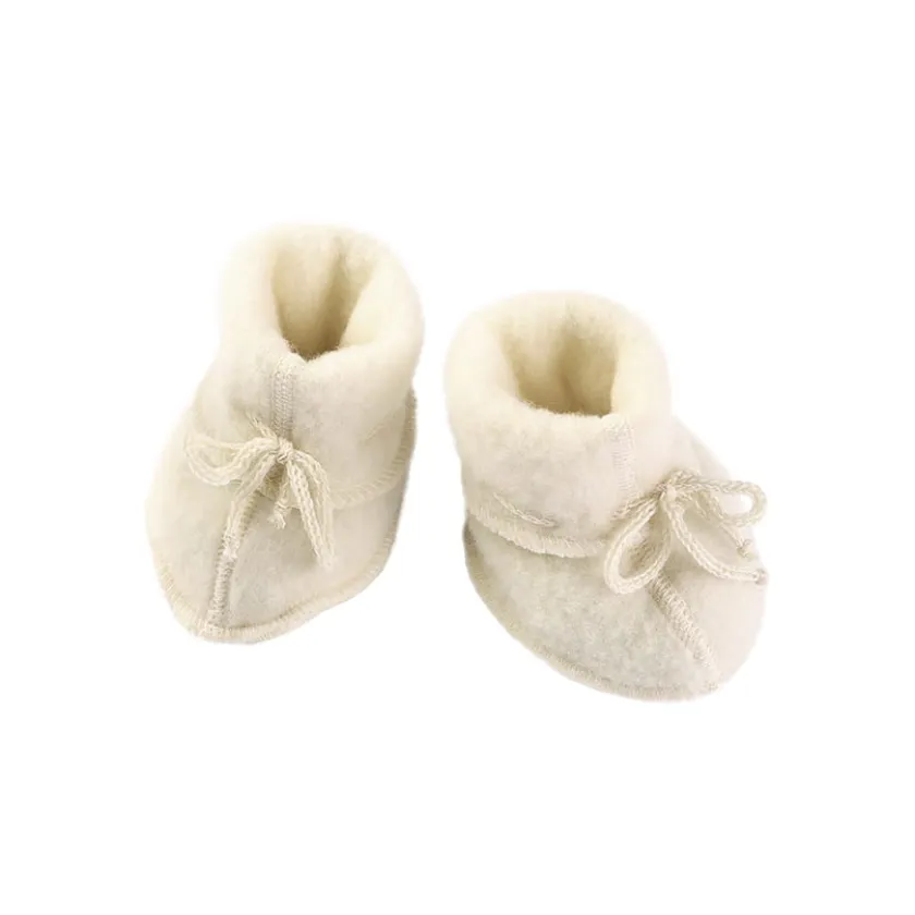Slofjes wolfleece ecru met een koordje om uitvallen te voorkomen.