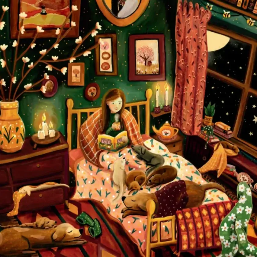 De Nederlandse ‘Illustrator under a blankie’ Esther Bennink creëert werelden die gevoelens van knusheid, geborgenheid en verwondering oproepen. Ze combineert voor haar illustraties verschillende materialen, met aquarelverf in de hoofdrol.