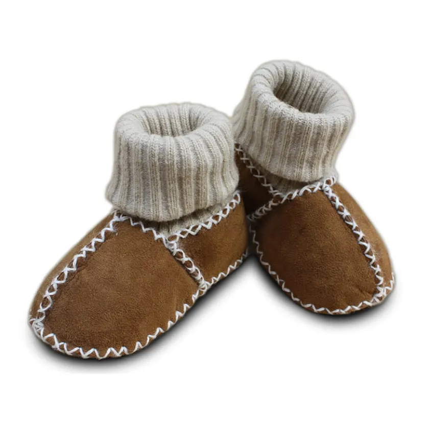 Schapenvacht slofjes bruin met hoge gebreide boord om uitvallen te voorkomen.