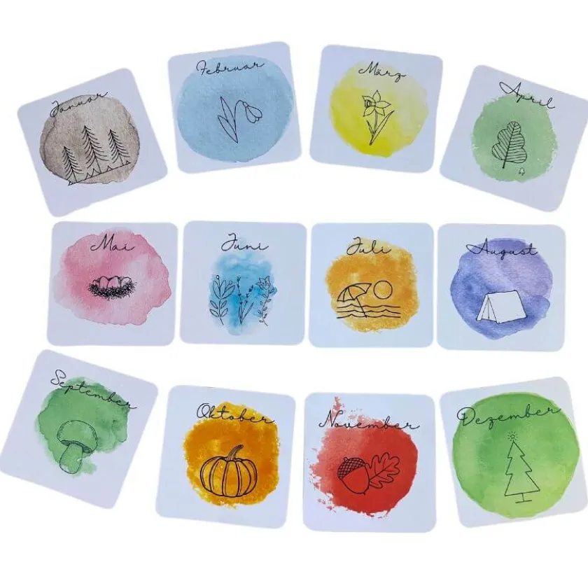 Monatskarten für ihren Festtagsring oder Steckerhalter. Für jeden Monat eine Karte mit einem farbigen Bild, und dem Monatsnamen auf Deutsch.