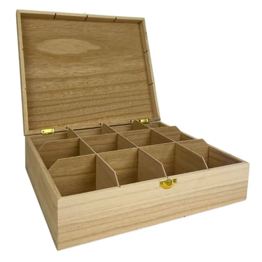 Houten kist met 12 vakken, om stekers voor je jaarring of stekerhouder in te bewaren. De afmetingen van deze bewaarkist zijn 29 x 25 x 8 cm (lxbxh).