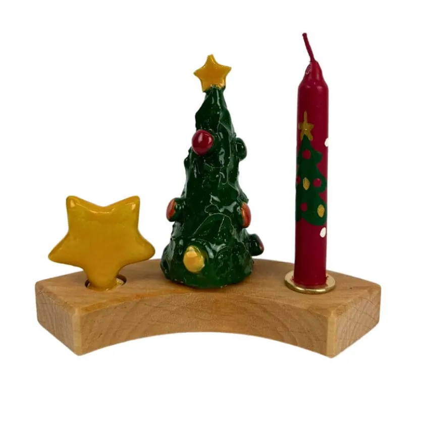 De 3-delige set bestaat uit 2 handgemaakte stekers van keramiek (ster, kerstboom) en een Kerst jaarring kaarsje.