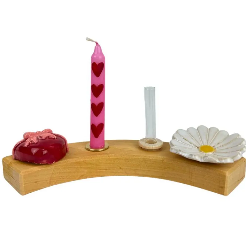 De 4-delige set bestaat uit 2 handgemaakte stekers van keramiek (hart met strik, madelief schaaltje), een hartjes jaarringkaarsje en een cilindervaasje van glas. Vul het cilindervaasje met een beetje water en een klein bloemetje voor een leuk effect.