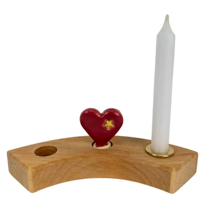 Deze 3-delige set bestaat uit een handgemaakte steker van keramiek (hartje met ster), messing kaarsenhoudertje en wit jaarring kaarsje.
