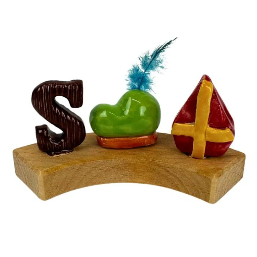 De 3-delige set bestaat uit 3 handgemaakte stekers van keramiek (mijter, pietenmuts, chocoladeletter)