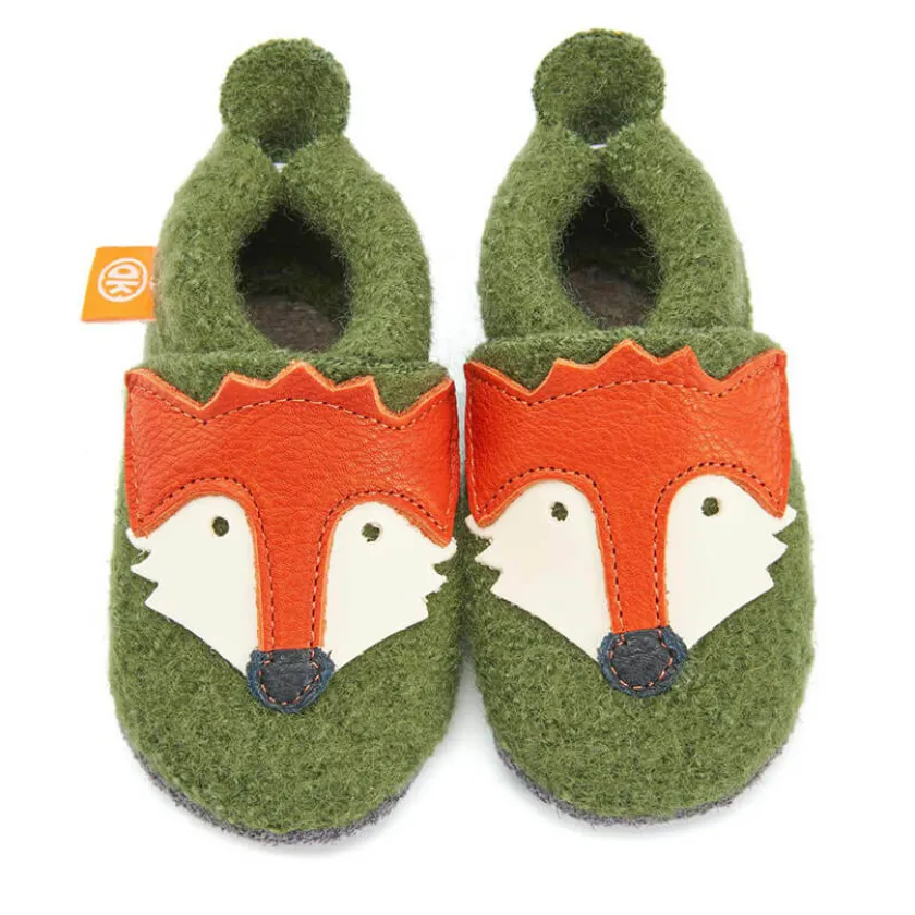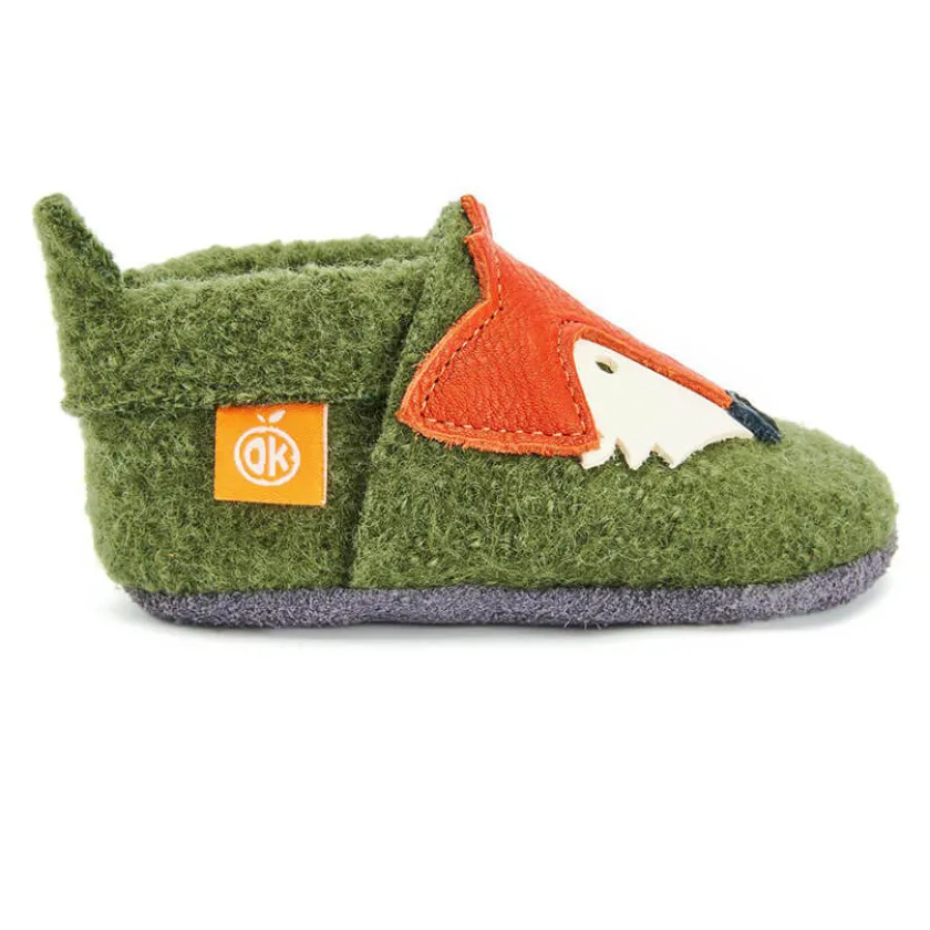 Beschrijving van Orangenkinder Sloffen wol Frans de vos – khaki