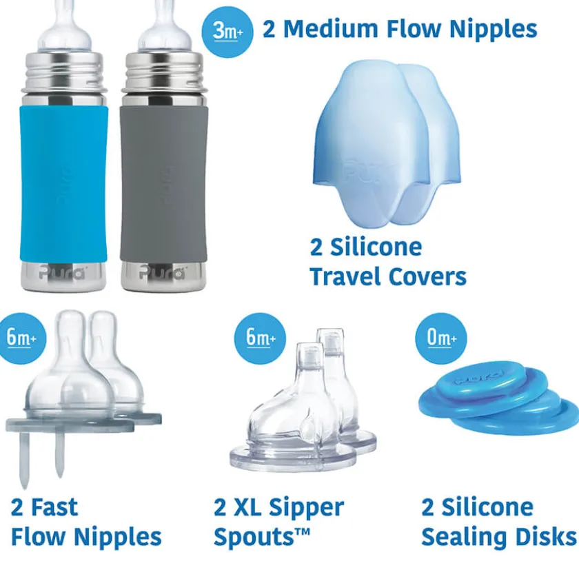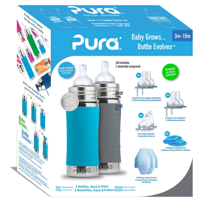 De award-winning Pura starterset bevat alles wat je nodig hebt voor je kindje! De RVS flessen van Pura zijn dé perfecte drinkflessen voor baby’s. Pura flessen zijn 100% plasticvrij en daarom veilig, milieuvriendelijk en bovenal praktisch. Door de mogelijkheid van het verwisselen van de top kan de fles meegroeien met het kind naar tuitbeker, rietjesbeker en beker met sportdop. Pura is als enige ter wereld NONToxic gecertificeerd door MadeSafe.org.