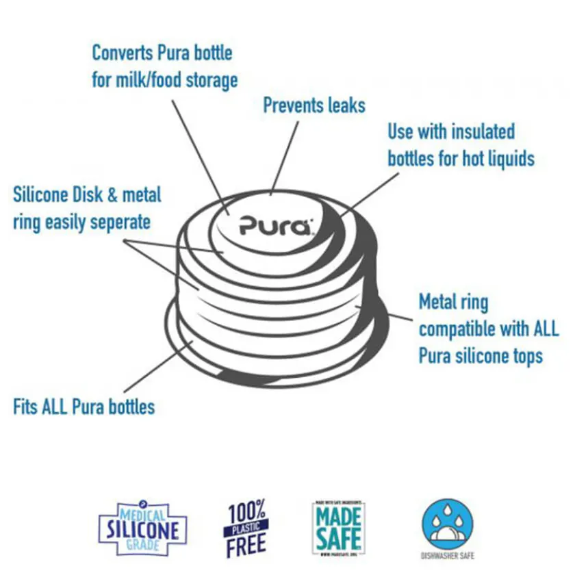 De Pura Universal Dop bevat een schroefdop en één afsluitdisk. De afsluitdisk is speciaal voor de Pura flessen, zodat deze flessen kunnen worden gebruikt voor bijvoorbeeld moedermelk opslag of als bewaardoosje voor snacks voor schoolgaande kinderen.