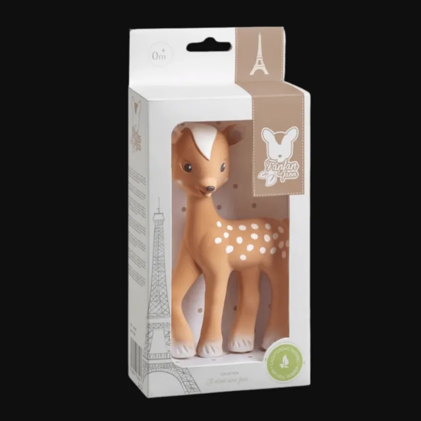 FanFan is het eerste hertje gemaakt van 100% natuurlijk rubber van de Hevea-boom en beschilderd met verf die geschikt is voor de voedingsmiddelenindustrie. Dat maakt FanFan volledig vrij van schadelijke stoffen zoals PVC, BPA, weekmakers en ftalaten. een veilig en duurzaam speelgoedvriendje voor je kleintje.